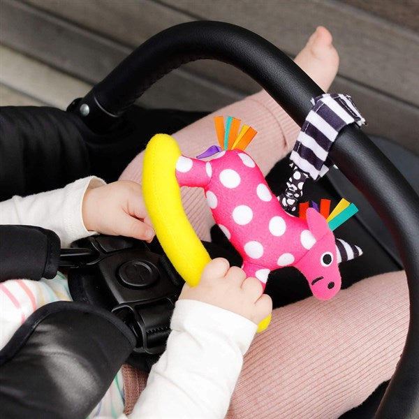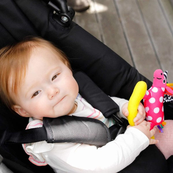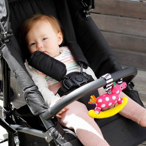 Sassyのキャラクターがジッタートイとして新登場!キャラクターを下に引っ張るとぶるぶると震えて、赤ちゃんの好きな音や触感などをたくさんのしかけで楽しめます。 ベビーカーやバッグに取り付けて。