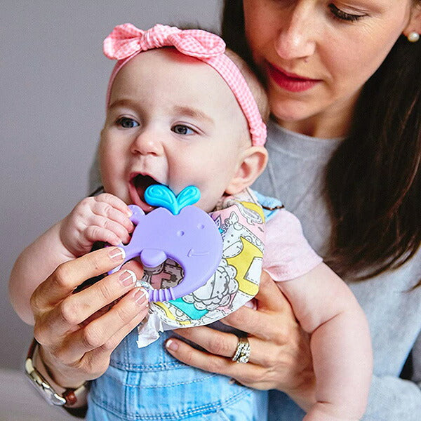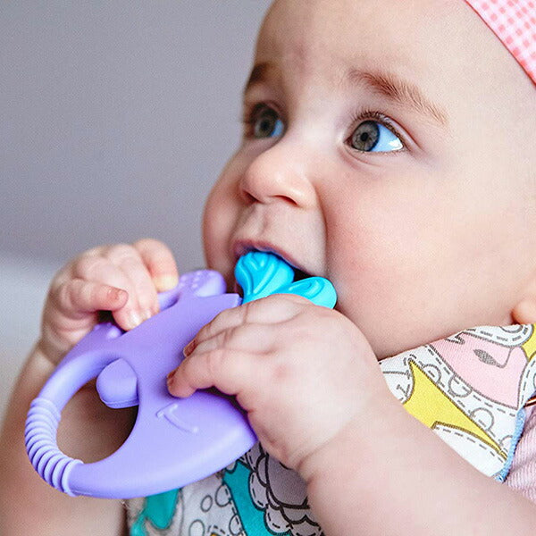 赤ちゃんの噛む感覚を養うために、複数の機能を備えています。様々な凹凸で食べ物を噛む感覚を経験でき、安全で柔らかいシリコーンの丸い形状は、赤ちゃんの小さな手で持ちやすいように設計されています。BPAおよびフタル酸フリーの素材で作られています。