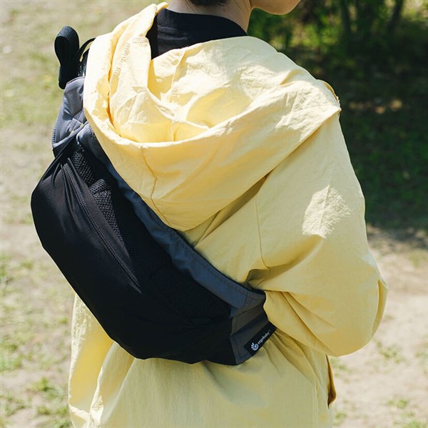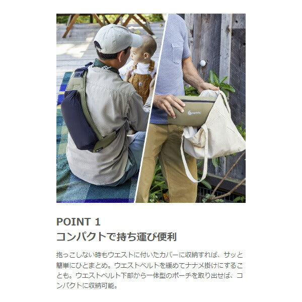 抱っこしない時もウエストに付いたカバーに収納すれば、サッと簡単にひとまとめ。ウエストベルトを緩めてナナメ掛けにすることも。ウエストベルト下部から一体型のポーチを取り出せば、コンパクトに収納可能。