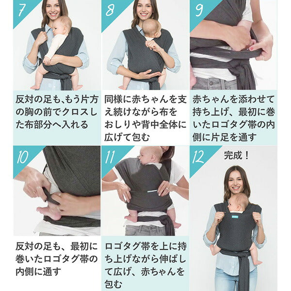 11.ロゴタグ帯を上に持ち上げながら伸ばして広げ、赤ちゃんを包む