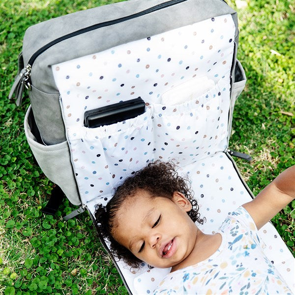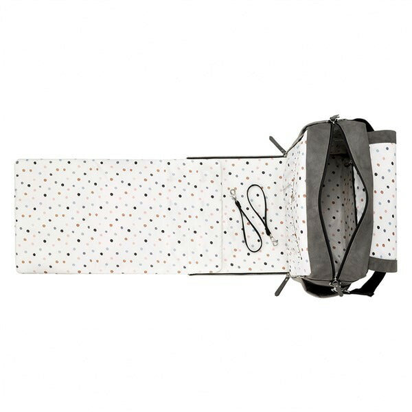 バッグの上を覆うフラップと両端のファスナーを開けば横幅30cm、長さ74cmほどのオムツ替えスペースに早変わり!オムツ替えシート端には、面ファスナーが付いていてバッグから取り外し可能。洗えて清潔にお使いいただけます。