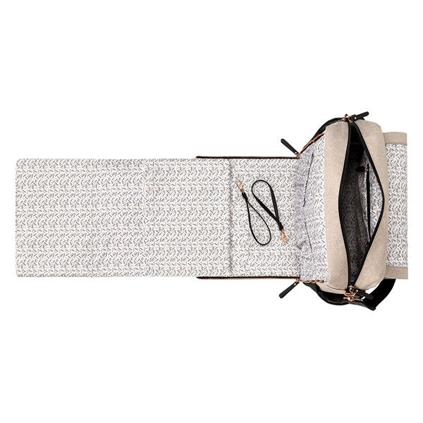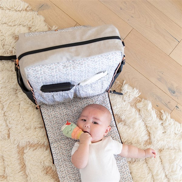 バッグの上を覆うフラップと両端のファスナーを開けば横幅30cm、長さ74cmほどのオムツ替えスペースに早変わり!オムツ替えシート端には、面ファスナーが付いていてバッグから取り外し可能。洗えて清潔にお使いいただけます。