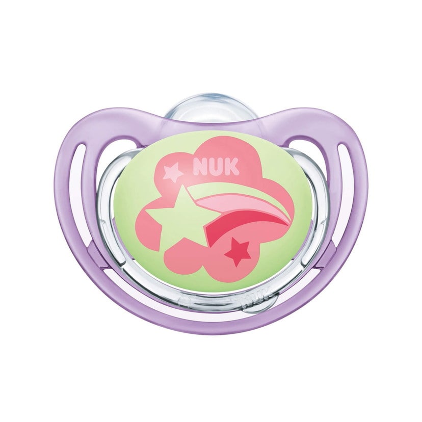 授乳時の乳首にそっくりで、上あごにぴったりフィットするヌークのおしゃぶりから、暗いところで光る「ナイトシリーズ」が登場。 夜使っていてお口から自然と外れてしまっても、光っているから見つけやすい! シールドにスリットが入っている通気性を考慮した設計で、肌への接触面が少なく、いつでも清潔に使えます。 付属のケースは、電子レンジ消毒ができるすぐれもの!持ち運びにも便利。