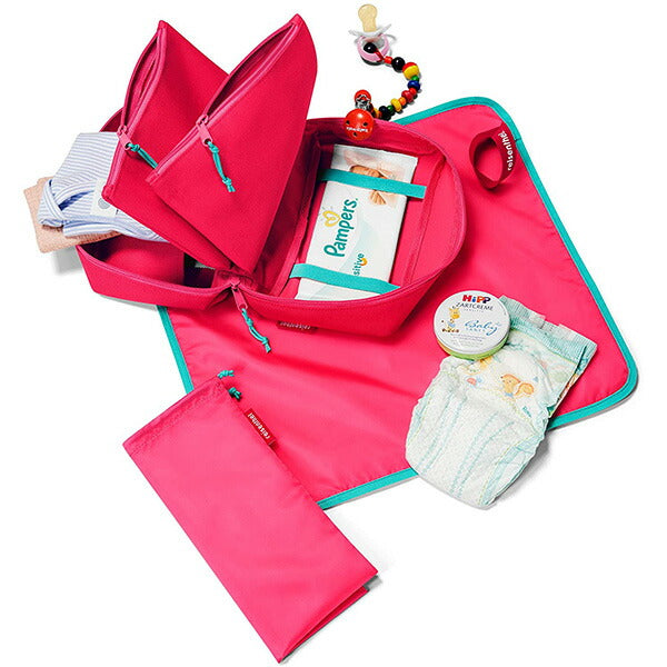 チャックを開けると2つのファスナーポケット付収納が付いているのでボディクリームやおしゃぶりなどの小物を収納できます。またかばんの両サイドにもゴムバンドと大きなポケットが付いているのでおむつやおしり拭きなども収納可能です。またお着替え用に、洗えるシートや汚れた服を収納できる巾着も付いています。
