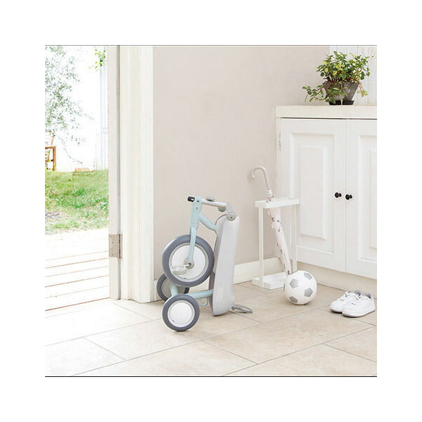 「お家でできたら、お外へぼうけん」小さいうちは、お家の中で乗り物遊びを楽ししんで。慣れてきたら、お外へぼうけんに出かけよう!低くて長いサドルなら成長に合わせてながーく遊べます。折りたためば玄関にスッキリコンパクト収納。
