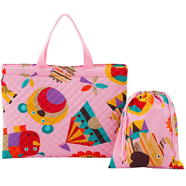 キルティング レッスンバッグ 巾着袋(小物入れ)付き ZOO ピンク フジキ 【手提げ お稽古 保育園 入園 小学校 小学生 ピアノ 習い事 日本製】【ネコポス送料無料】