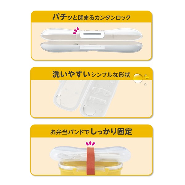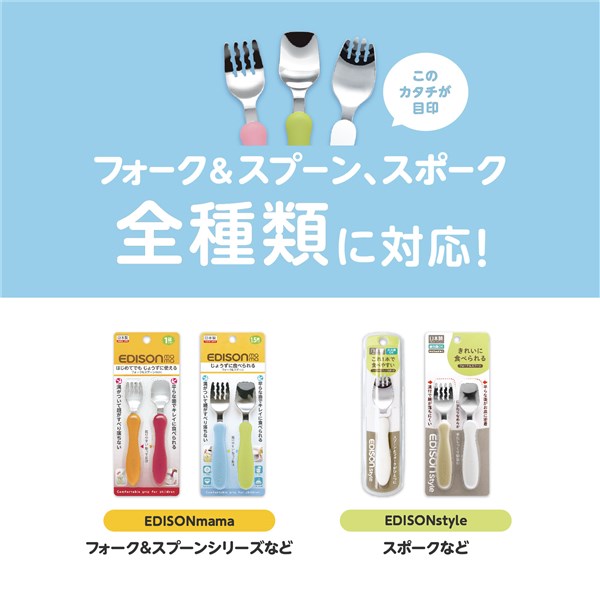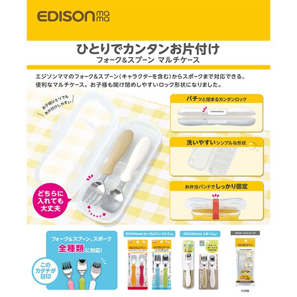 エジソンママのフォーク&スプーン(キャラクターを含む)からスポークまで対応できる、便利なマルチケースです。お子様も開け閉めしやすいパチッと閉まる簡単ロック形状です。