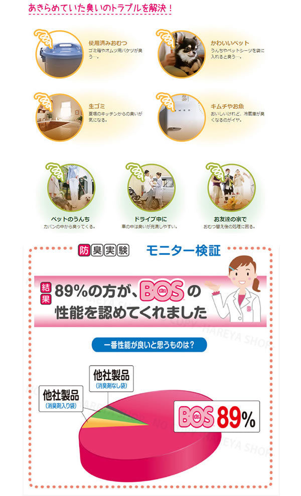※BOSの防臭性能は大変優れていますが、完全に防ぐものではありません。バケツなどに密閉しますと、わずかに漏れる臭いがバケツ内に溜まり、臭いを感じることがあります。
