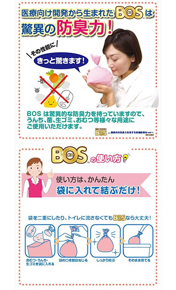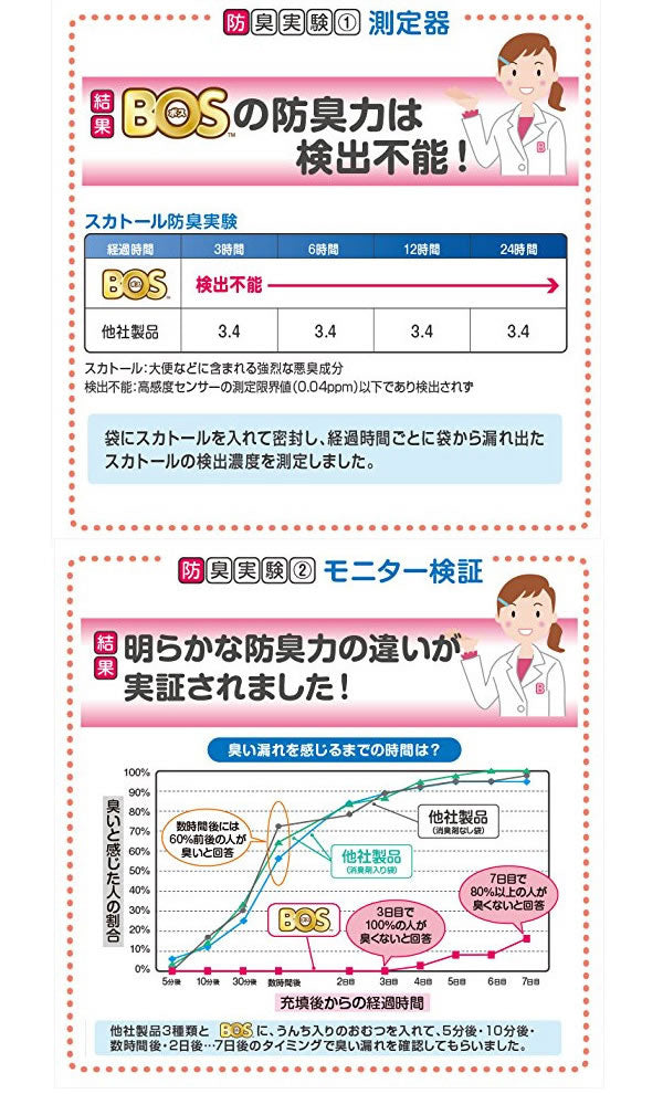 BOSはうんちを入れて、しばらく放置後に鼻を近づけても臭いを感じることのない、驚異的な防臭力を持った世界発の新素材です。