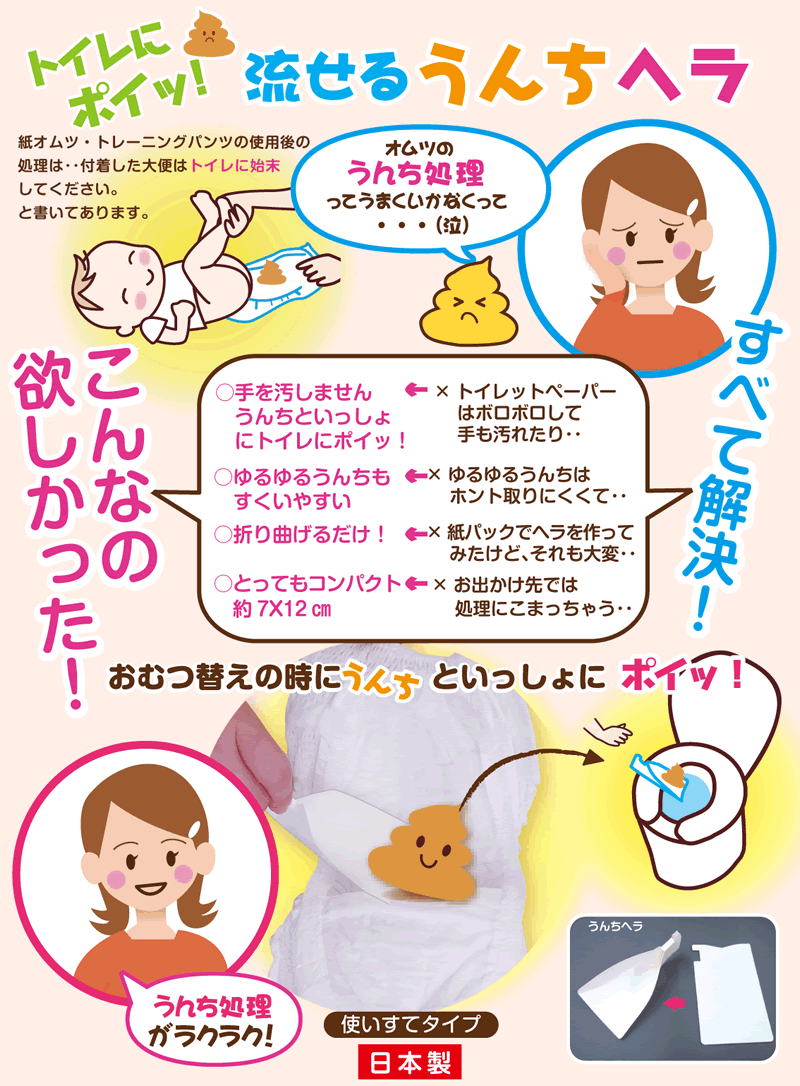 おむつに付いたうんちをすくってそのままトイレに流せるヘラです。