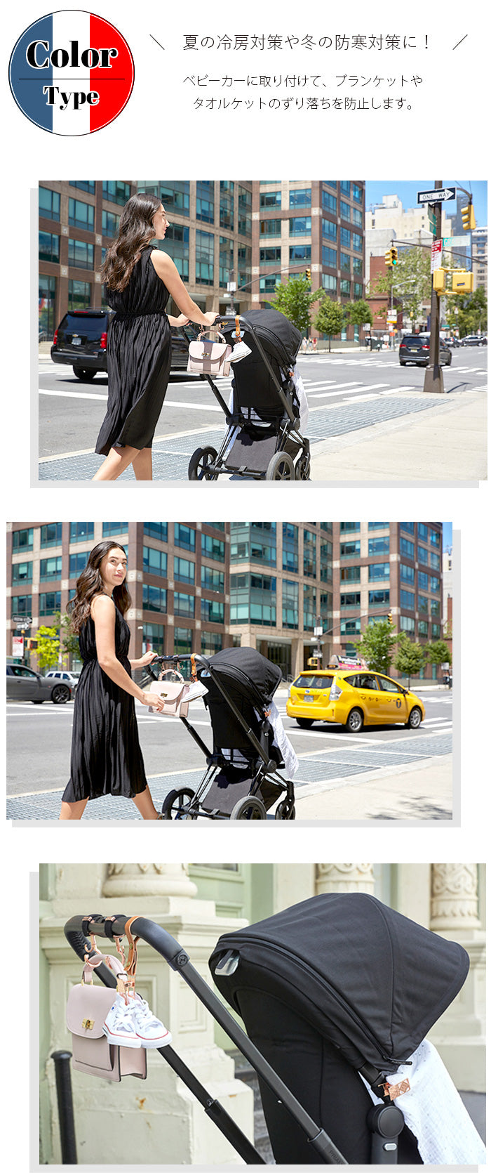 ●夏の冷房対策や冬の冷房対策に:ベビーカーに取り付けてブランケットやタオルのずれ落ちを防止します。