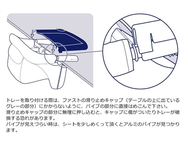 ワンタッチで付け外しができ、食べこぼしもトレーごと丸洗いできるので後片づけが簡単です。