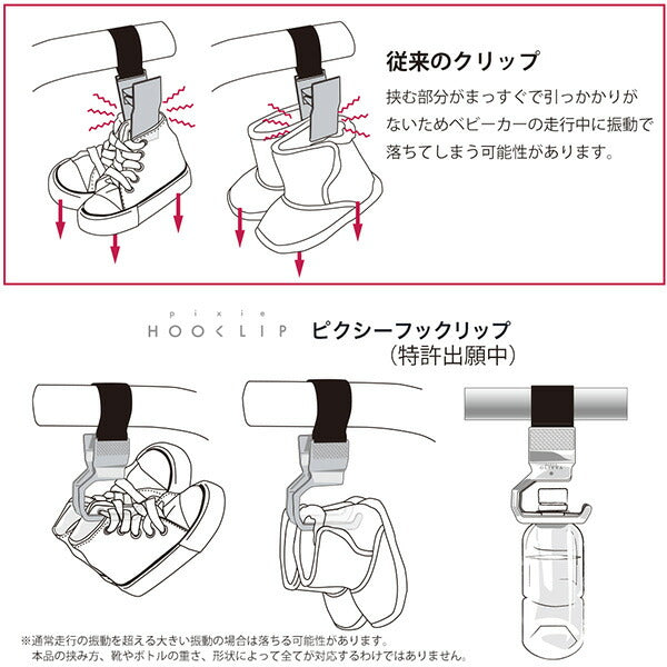 お子様が脱いだ靴をしっかり挟んでくれるシューズクリップです。お出かけの際に、靴の紛失を防止します。スニーカーやブーツもしっかりキャッチします。シューズクリップの他には、ボトルクリップとしてもお使い頂けます。従来のクリップは挟む部分がまっすぐで引っかかりがないためベビーカーの走行中に振動で落ちてしまう可能性があります。ピクシーフックリップは、C字型で差し込んで挟むので簡単に落ちない仕組みです。薄いキャンバスタイプや、分厚いムートンブーツも対応。シューズクリップとして引っかけながら挟むのでお子様の靴が落ちる心配は不要です。