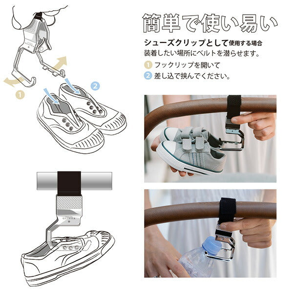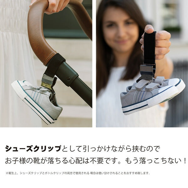 お子様が脱いだ靴をしっかり挟んでくれるシューズクリップです。お出かけの際に、靴の紛失を防止します。スニーカーやブーツもしっかりキャッチします。シューズクリップの他には、ボトルクリップとしてもお使い頂けます。従来のクリップは挟む部分がまっすぐで引っかかりがないためベビーカーの走行中に振動で落ちてしまう可能性があります。ピクシーフックリップは、C字型で差し込んで挟むので簡単に落ちない仕組みです。薄いキャンバスタイプや、分厚いムートンブーツも対応。シューズクリップとして引っかけながら挟むのでお子様の靴が落ちる心配は不要です。