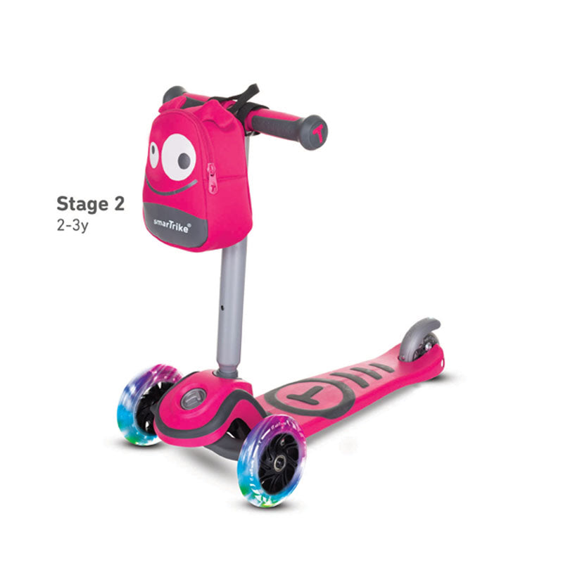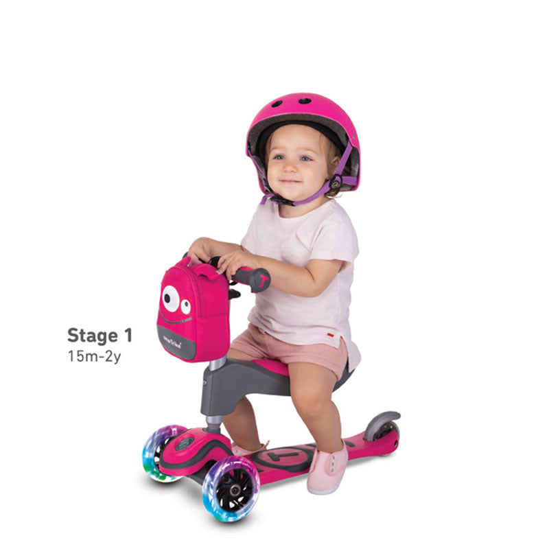 ステージ1(15~24カ月):ライディング練習。お子様が座って足で蹴りやすい快適なシート。スクーティングの基礎技術を獲得し、スクーティングコーディネーションを発展させます。