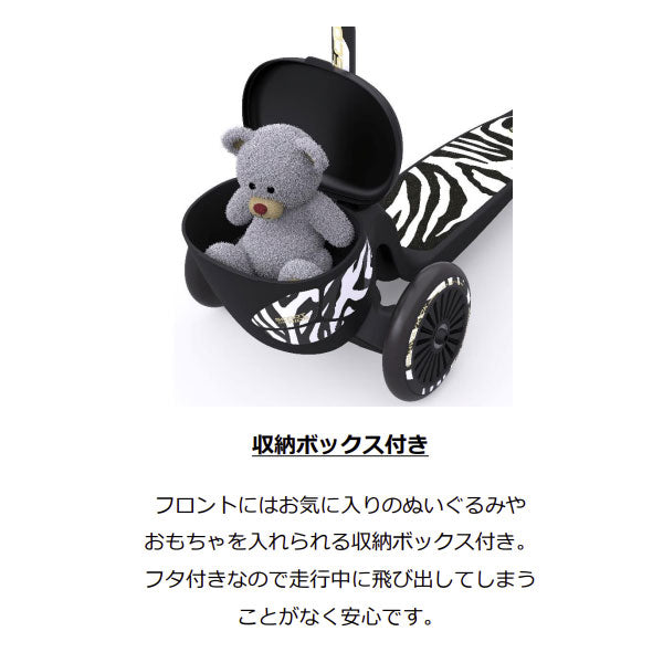 フロントにはお気に入りのぬいぐるみやおもちゃを入れられる収納ボックス付き。フタ付きなので走行中に飛び出してしまうことがなく安心です。ハンドルを切らずに体重移動で曲がる仕組みで、バランス感覚や体の使い方を養います。前輪2輪の3輪タイプなので安定性が高く、スクーターが初めてのお子さまでも安心してご使用頂けます。