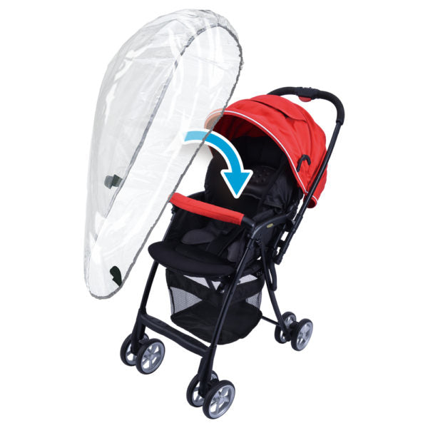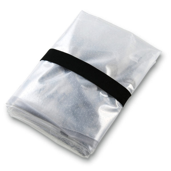 被せるだけでサッと取り付けられるベビーカー用レインカバーです。口まわり上部にはゴムが入っているので伸縮してベビーカーにかぶせやすく、突然の雨でもサッと簡単に取り付ける事ができます。素材は雨を通さず、空気を通す特殊シートを採用しています。全面が透明で中が見えるので安心です。すそをまくれば、取り付けたままでもお子様の乗り降りができます。使用後は付属のゴムバンドでとめればコンパクトに収納できます。