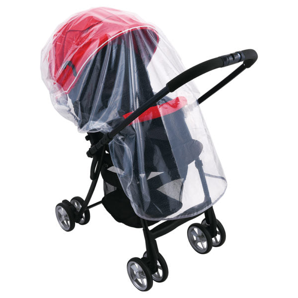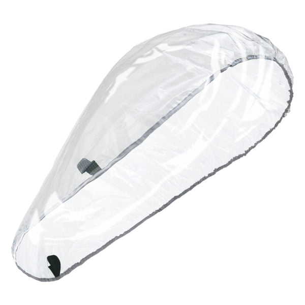 被せるだけでサッと取り付けられるベビーカー用レインカバーです。口まわり上部にはゴムが入っているので伸縮してベビーカーにかぶせやすく、突然の雨でもサッと簡単に取り付ける事ができます。素材は雨を通さず、空気を通す特殊シートを採用しています。全面が透明で中が見えるので安心です。すそをまくれば、取り付けたままでもお子様の乗り降りができます。使用後は付属のゴムバンドでとめればコンパクトに収納できます。