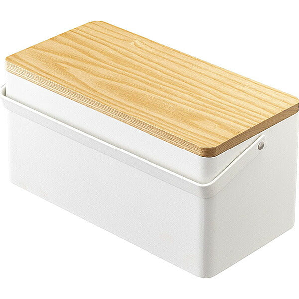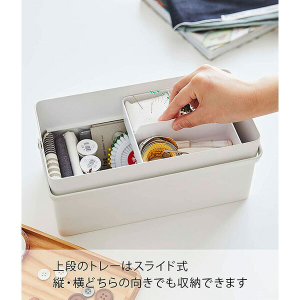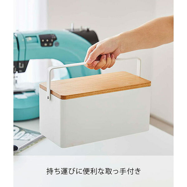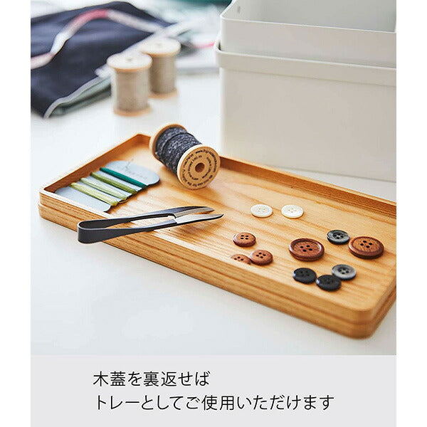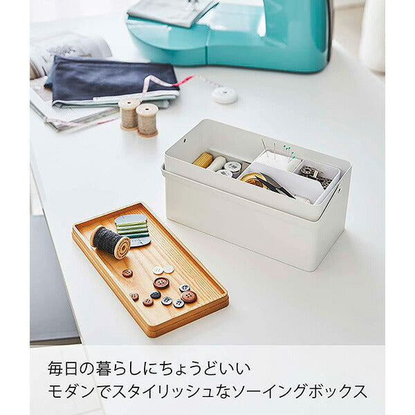 毎日の暮らしにちょうどいい。モダンでスタイリッシュなソーイングボックス。裁縫用品を収納するのにちょうどいいサイズ。お手持ちの裁縫用具を収納して便利にご使用いただけます。トレーは取り出すことができるので、卓上で道具類を散らかさずに裁縫できます。上段のトレーはスライド式。縦・横どちらの向きでも収納できます。木蓋を裏返せばトレーとしてご使用いただけます。持ち運びに便利な取っ手付き。
