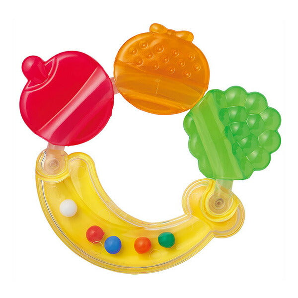 りんご・オレンジ・マスカットは、なめなめ・かみかみしやすいやわらか素材。ビーズが入っているから、振るとジャラジャラ!