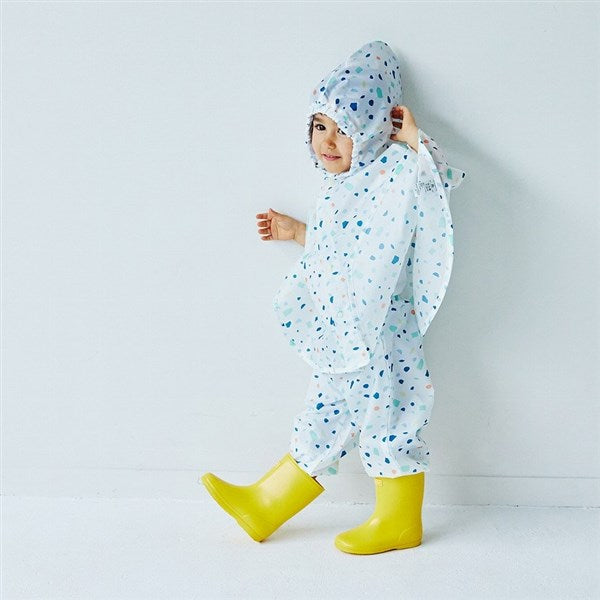 パンツ+ポンチョのセット=パンチョ サッと羽織れるポンチョタイプなので小さいお子さまにも着せやすく、フード回りがゴム入りなので強風でも脱げにくい。パンツは裾の部分がゴム入りなので雨からしっかりガード。持ち運びしやすい筒型収納ポーチ付き。かわいいテキスタイルが雨の日のお出かけをおしゃれに演出します。