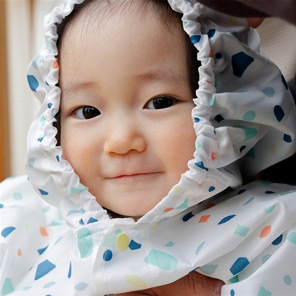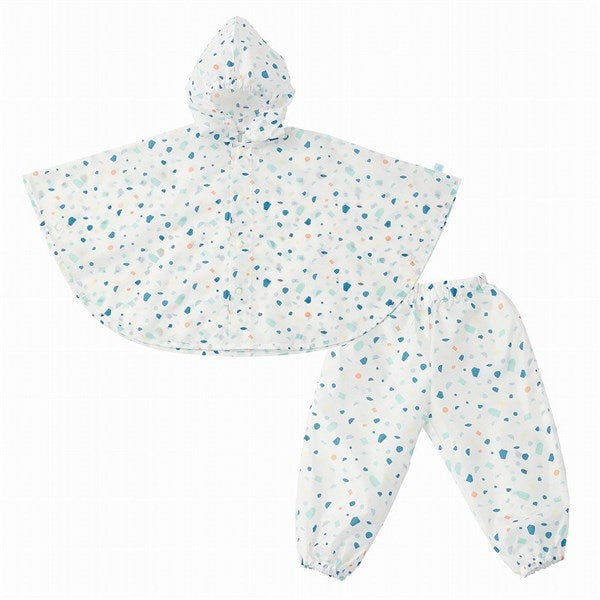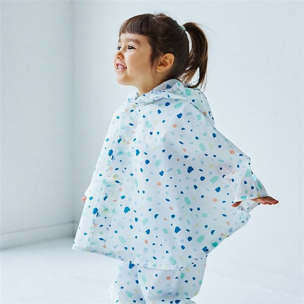 パンツ+ポンチョのセット=パンチョ サッと羽織れるポンチョタイプなので小さいお子さまにも着せやすく、フード回りがゴム入りなので強風でも脱げにくい。パンツは裾の部分がゴム入りなので雨からしっかりガード。持ち運びしやすい筒型収納ポーチ付き。かわいいテキスタイルが雨の日のお出かけをおしゃれに演出します。