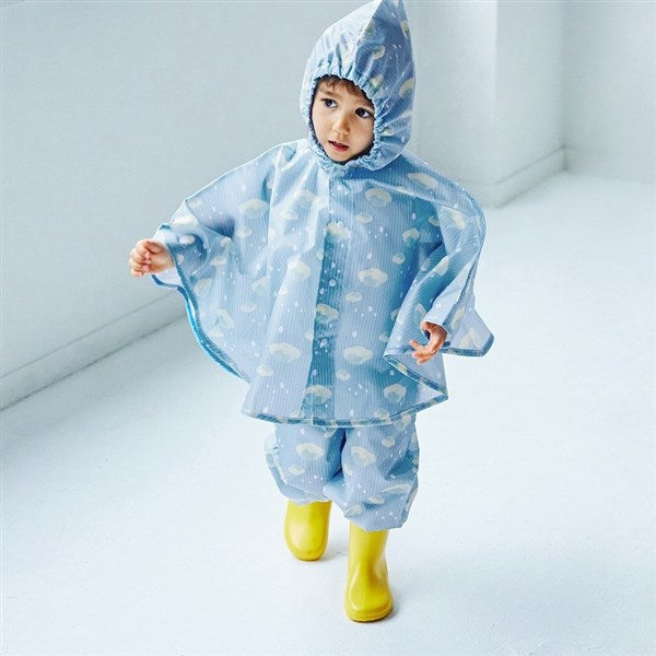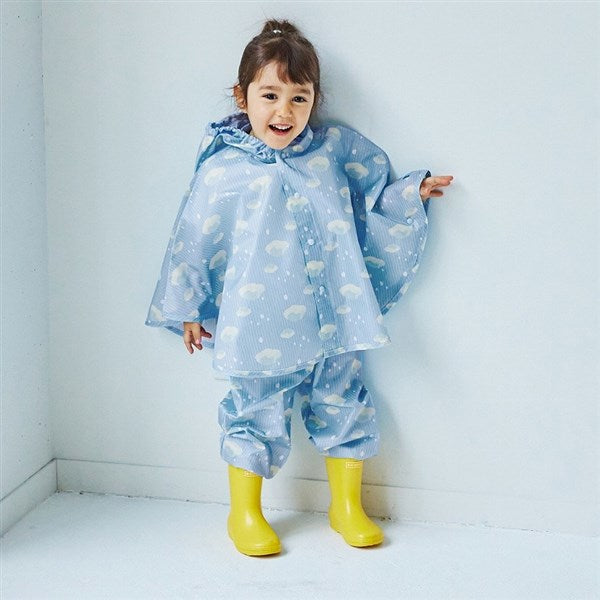 パンツ+ポンチョのセット=パンチョ サッと羽織れるポンチョタイプなので小さいお子さまにも着せやすく、フード回りがゴム入りなので強風でも脱げにくい。パンツは裾の部分がゴム入りなので雨からしっかりガード。持ち運びしやすい筒型収納ポーチ付き。かわいいテキスタイルが雨の日のお出かけをおしゃれに演出します。