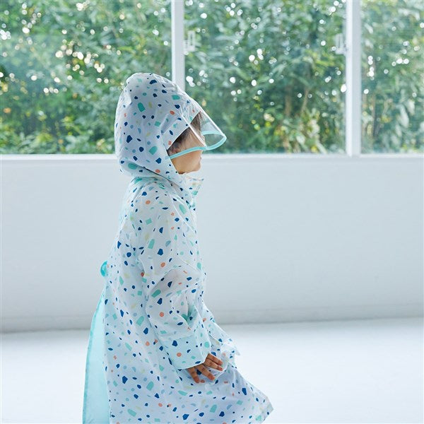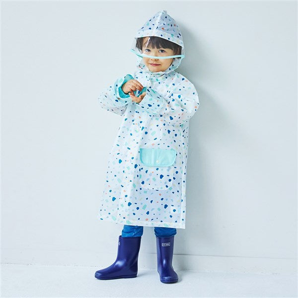 ハイネック仕様でフードが脱げにくく、透明つばで視界もクリア。雨が入りにくい二重袖仕様で、脇下にはムレにくい通気穴があります。背面にはリュックをしょったままでも着られるタックと、反射プリントで暗くても安心。持ち運びしやすい筒型収納ポーチ付き。かわいいテキスタイルが雨の日のおでかけをおしゃれに演出します。