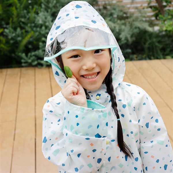 ハイネック仕様でフードが脱げにくく、透明つばで視界もクリア。雨が入りにくい二重袖仕様で、脇下にはムレにくい通気穴があります。背面にはリュックをしょったままでも着られるタックと、反射プリントで暗くても安心。持ち運びしやすい筒型収納ポーチ付き。かわいいテキスタイルが雨の日のおでかけをおしゃれに演出します。