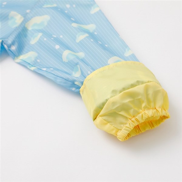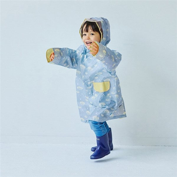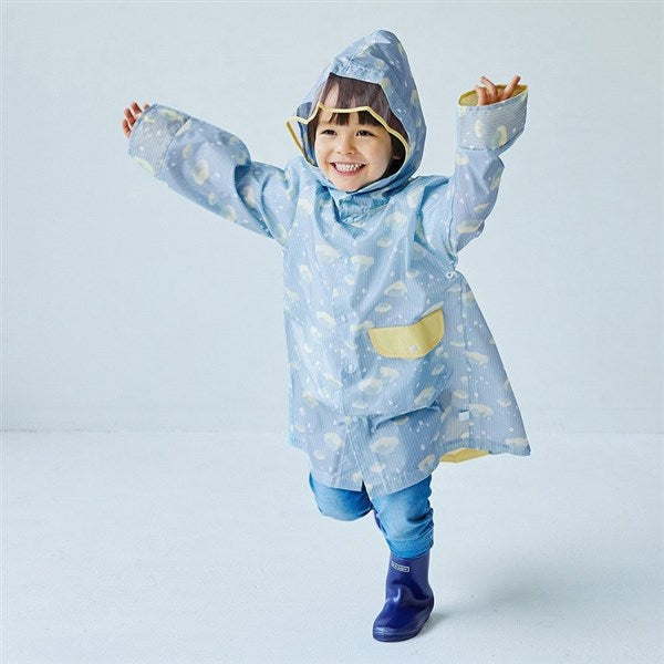 ハイネック仕様でフードが脱げにくく、透明つばで視界もクリア。雨が入りにくい二重袖仕様で、脇下にはムレにくい通気穴があります。背面にはリュックをしょったままでも着られるタックと、反射プリントで暗くても安心。持ち運びしやすい筒型収納ポーチ付き。かわいいテキスタイルが雨の日のおでかけをおしゃれに演出します。