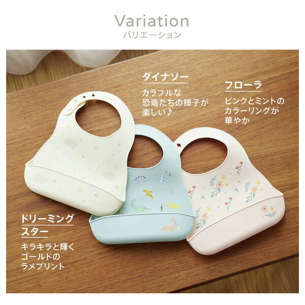 さっと水洗いでき、お手入れ簡単なシリコーン製ビブ。立体ポケットが食べこぼしをしっかりキャッチ!カトラリーを入れてコンパクトに収納可能。お子さまに合わせて首回りのサイズ調整可能です。クリアボックス入りでギフトにもぴったり。
