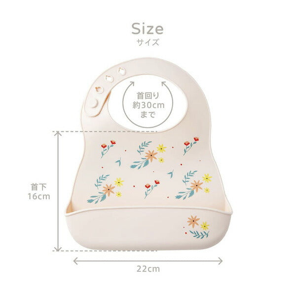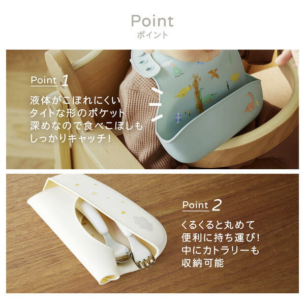 さっと水洗いでき、お手入れ簡単なシリコーン製ビブ。立体ポケットが食べこぼしをしっかりキャッチ!カトラリーを入れてコンパクトに収納可能。お子さまに合わせて首回りのサイズ調整可能です。クリアボックス入りでギフトにもぴったり。