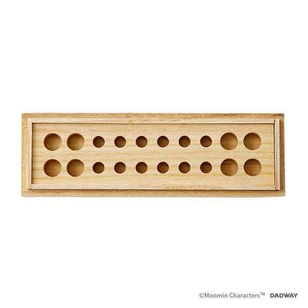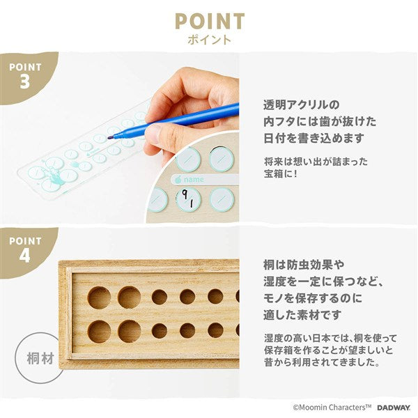 歯を20本収納可能。桐は防虫効果や湿度を一定に保つなどの保管に適した特性を持ちます。大小の穴に、前歯と奥歯を分けて入れられます。透明アクリルの内フタに油性ペンで歯の抜けた日を記入できます。ムーミンを迎えるムーミンパパとムーミンママのアートを使用。お子さまの成長を喜ぶ気持ちを表現したデザインです。