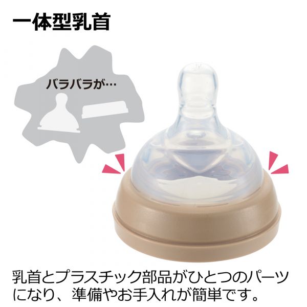 一体型乳首で、消毒後の乳首に触れることなく、ボトルにセットすることができます。