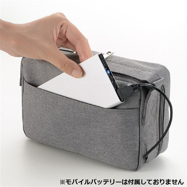 ケーブル穴からUSBケーブルを出して、外側ポケットにモバイルバッテリーを入れられます。
