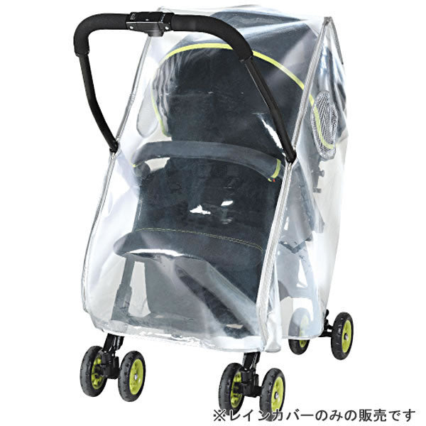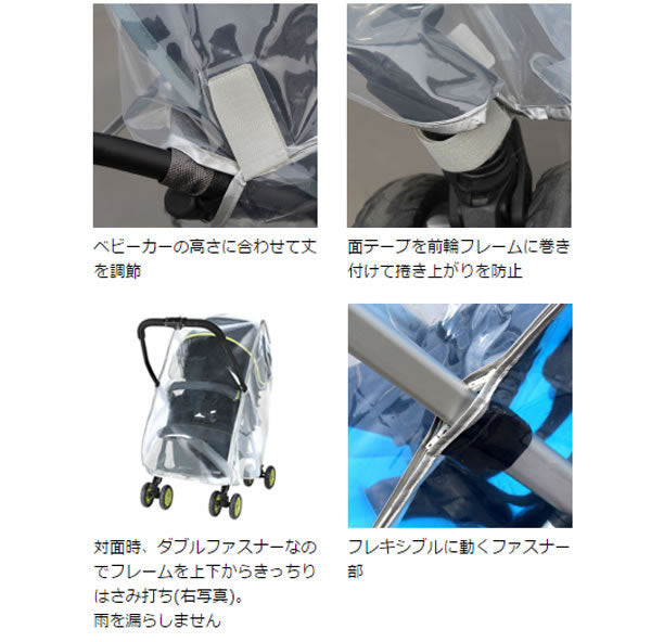 「1」4輪ベビーカー用レインカバー。高さ調節機能付きで大型から小型まで車種を問わず取り付けが可能です。