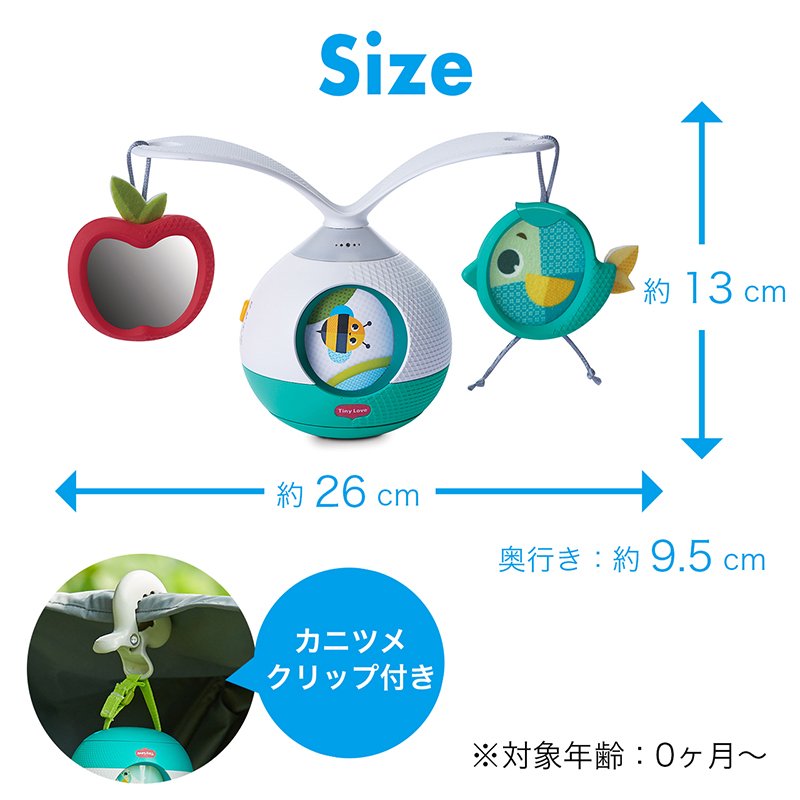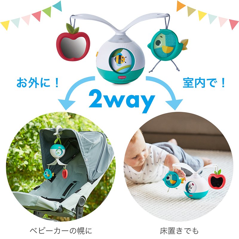 置いた状態で遊ぶだけでなく、クリップをつければベビーカーにぶら下げて外でも使えるメリーに変身!