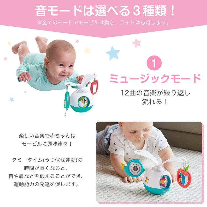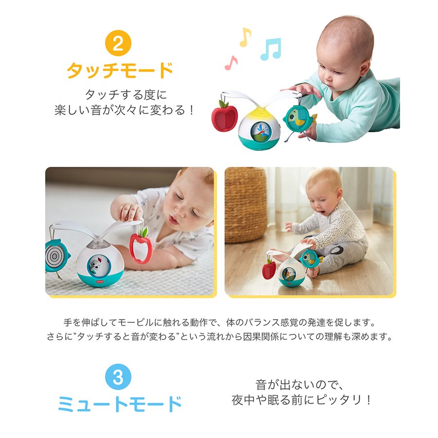 光って音楽が流れるミュージックモード・赤ちゃんがタッチすると音楽が変わるタッチモード・音楽が流さず遊べるミュートモード
