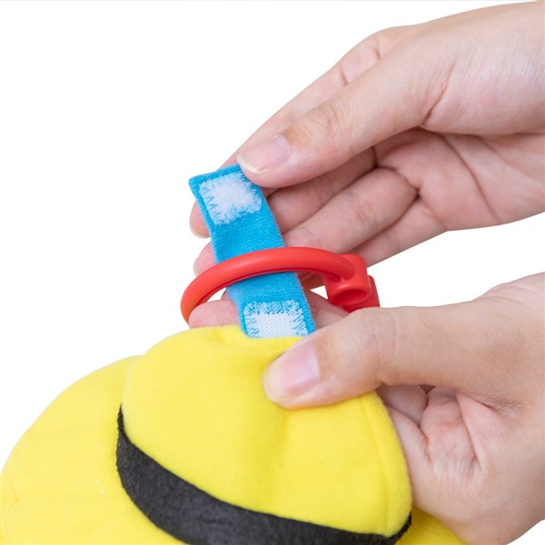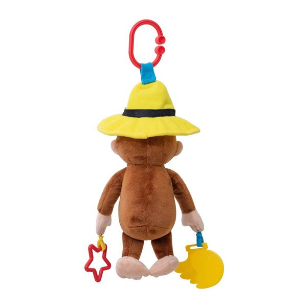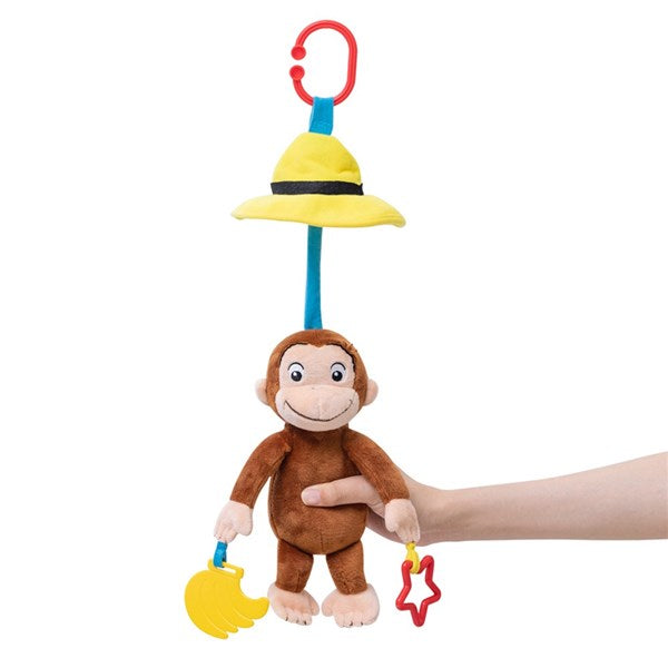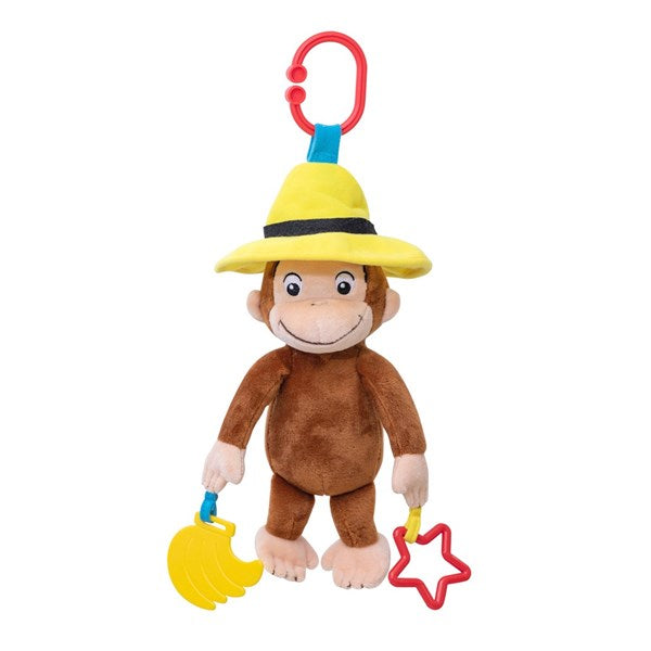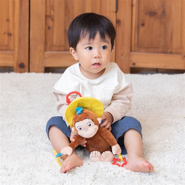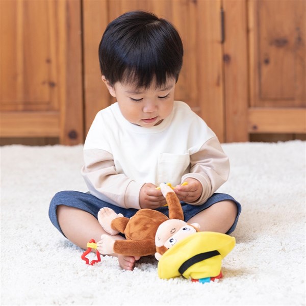 ジョージを引っ張るとブルブルしながら戻ってきます。ジョージは振るとカランカランと優しい鈴の音色がなり、バナナの形のティーザーやかわいい星型のリングがついていて、おうちでもお外でも楽しく遊べます。お出かけに便利なCリング付きです。