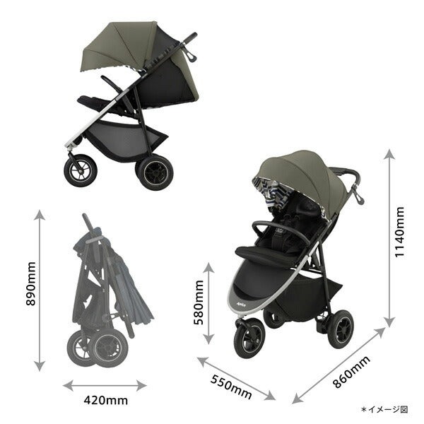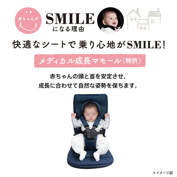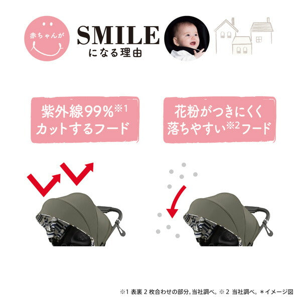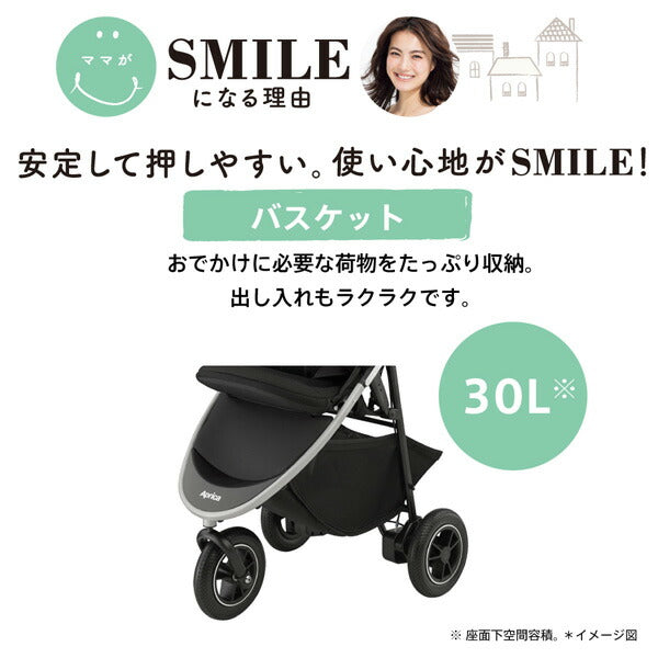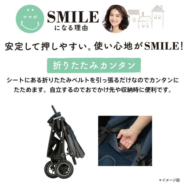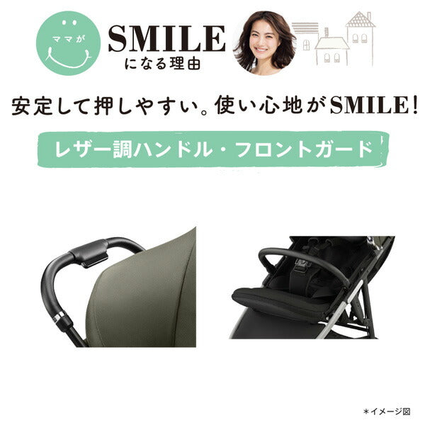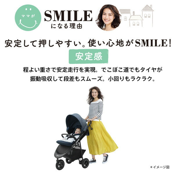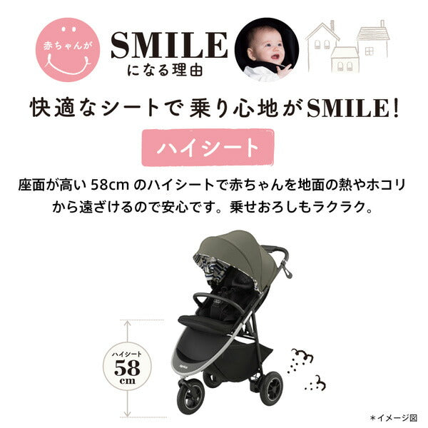 自然な姿勢をサポートする「メディカル成長マモール」や地面の熱やホコリから遠ざける58cmの「ハイシート」等による快適な乗り心地で赤ちゃんスマイル。小回りや段差もスムーズな「安定走行」と空気入れ不要の「メンテナンスフリータイヤ」等による使い心地の良さでママもスマイル。