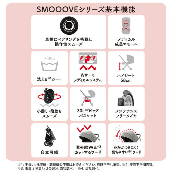 安定の走行性と快適なシート構造を実現。赤ちゃんとママに必要な全部が揃った3輪ベビーカー「スムーヴ」シリーズのスタンダードモデル。