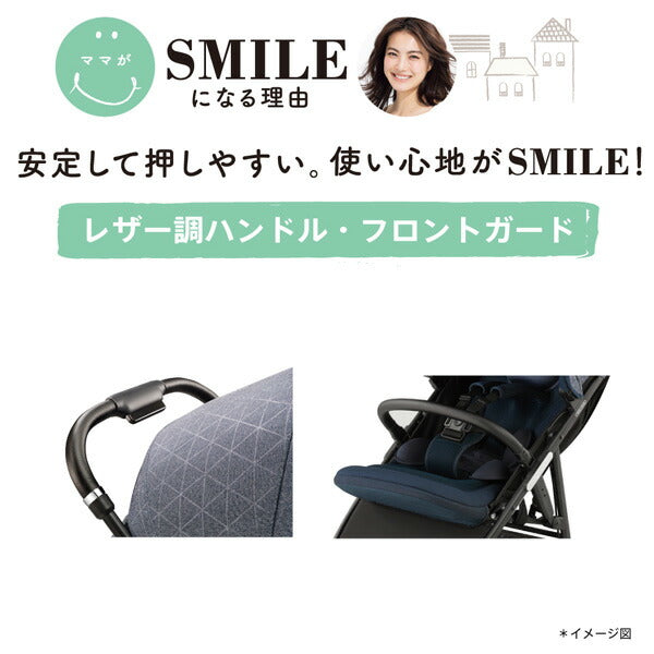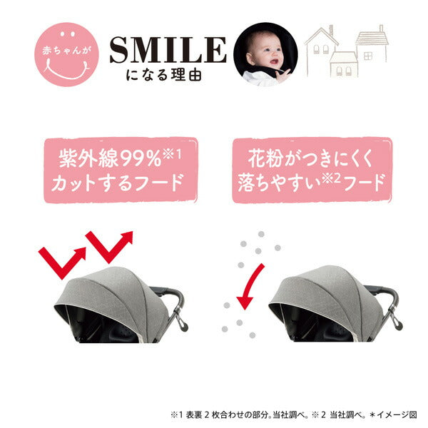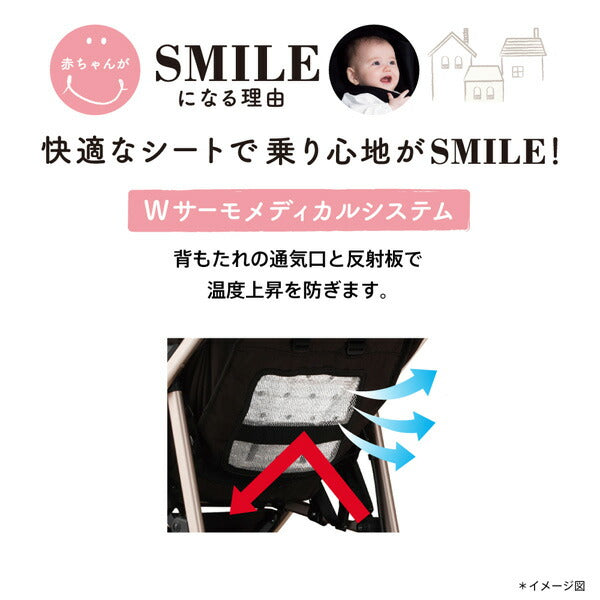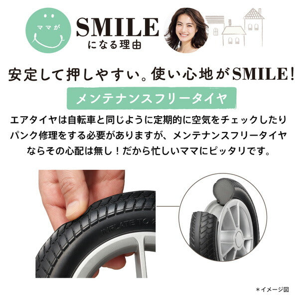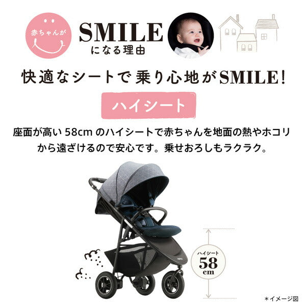 自然な姿勢をサポートする「メディカル成長マモール」や地面の熱やホコリから遠ざける58cmの「ハイシート」等による快適な乗り心地で赤ちゃんスマイル。小回りや段差もスムーズな「安定走行」と空気入れ不要の「メンテナンスフリータイヤ」等による使い心地の良さでママもスマイル。