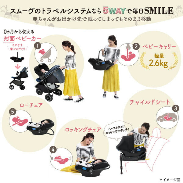 専用のインファントカーシート(別売)をつけると、対面で0カ月から使え、さらに5WAYで毎日活躍するトラベルシステムになり、赤ちゃんとのお出かけがさらにスムーズに。