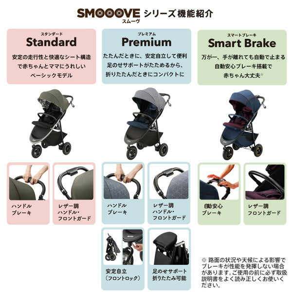 安定の走行性と快適なシート構造を実現。赤ちゃんとママに必要な全部が揃った3輪ベビーカー「スムーヴ」シリーズのプレミアムモデル。