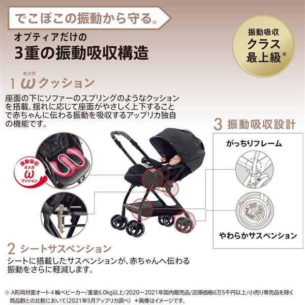 独自の振動吸収構造「ω(オメガ)クッション」に加えて、オプティアには「シートサスペンション」も搭載。アップリカのベビーカーの基本となる振動吸収設計(「がっちりフレーム」と「やわらかサスペンション」)と合わせて3重の備えでクラス最上級※1の振動吸収力を実現。