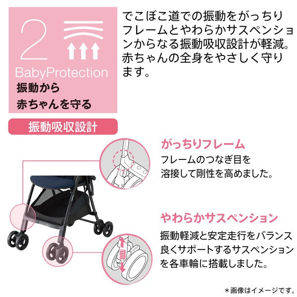 でこぼこ道での振動をがっちりフレームとやわらかサスペンションからなる振動吸収設計が軽減。赤ちゃんの全身をやさしく守ります。