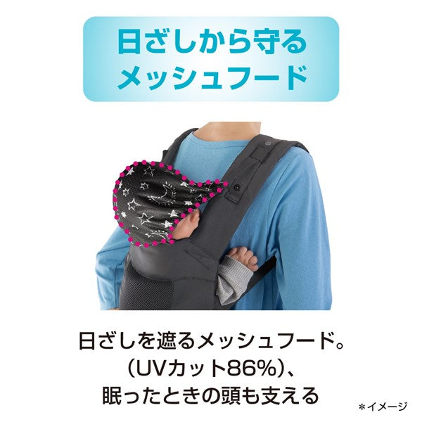 日ざしを遮るメッシュのフード。(UVカット86%)眠ったときの頭も支えます。
