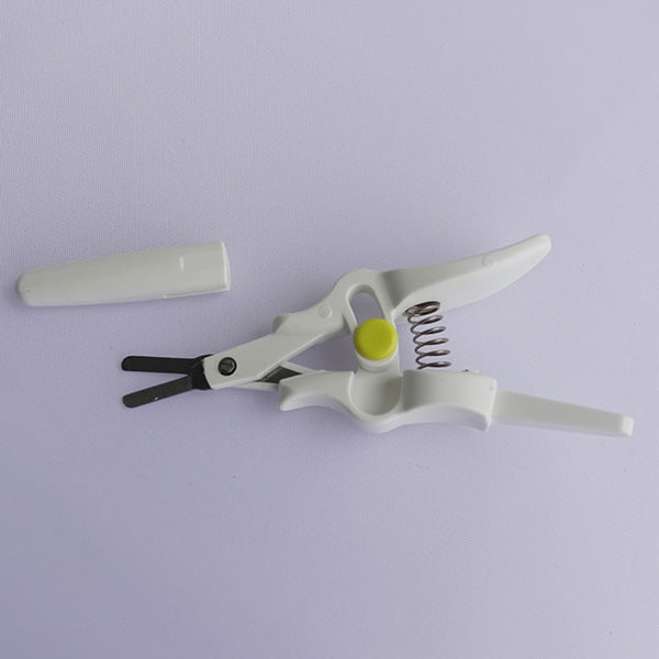バネ式のハンドルは開閉スムーズで、短めの刃先が小さいツメに使いやすいハサミタイプのツメキリです。使わないときは刃先を保護、使用中はハンドルの後ろに装着することで操作性UP