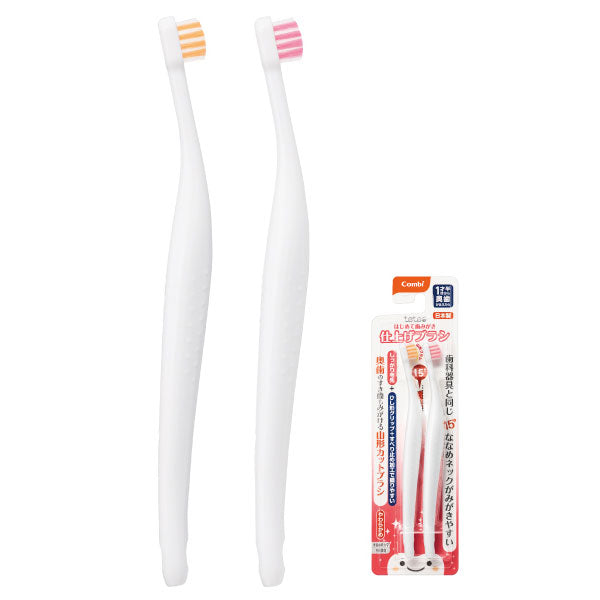 小児歯科の専門医との共同開発にて生まれた仕上げみがき用歯ブラシから、奥歯のすき間もみがきやすい、しっかり毛先タイプの仕上げブラシが登場。お子さまのためにみがき残しがないように、15°ななめネック、山形ブラシ、指にフィットするひし形グリップなど、ママ&パパが使いやすいための工夫がいっぱいつまっています。2本入(オレンジ・ピンク各1本)。