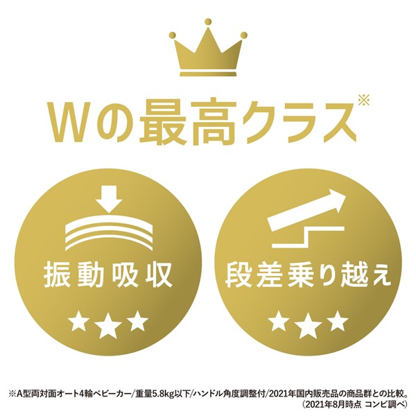 ※A型両対面オート4輪ベビーカー/重量5.8kg以下/ハンドル角度調整付/2021年国内販売品の商品群において。(2021年8月時点 コンビ調べ)